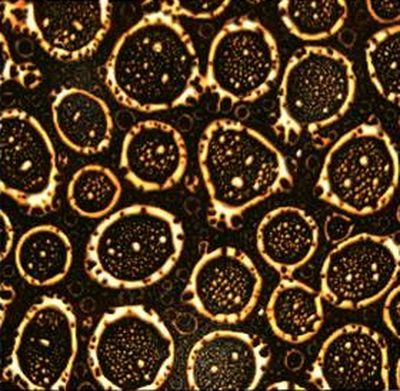 The remaining polystyrene block of a thin film of the diblock copolymer PS-b-PMMA on Si, after microphase separation and removal of the polymetylmethacrylate block.