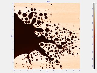 Dendrite structure formed at Plasma-Assisted Thermal Vapor Deposition of poly(ethylene) over poly(ethylene oxide)-like plasma polymer.The color contrast corresponds to the 0-10 nm range.
